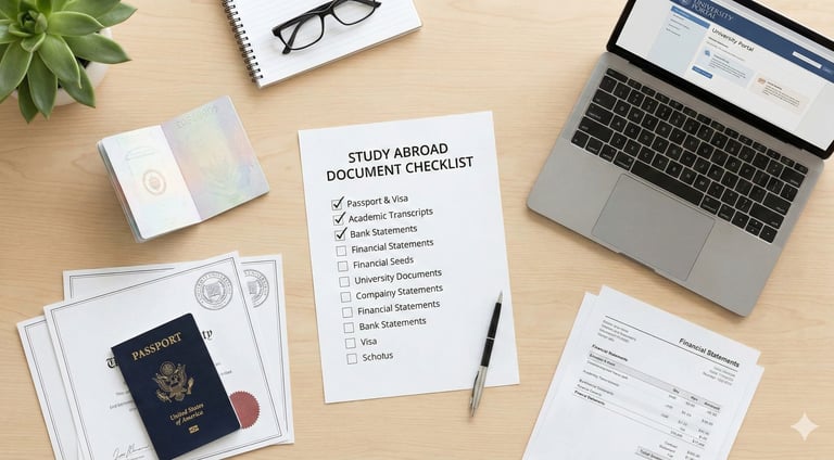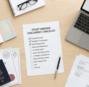 A clear, step-by-step document checklist for students applying for international universities. Learn what documents you need for admissions, visas, financial proof, travel, and interviews to ensure a smooth overseas education journey.